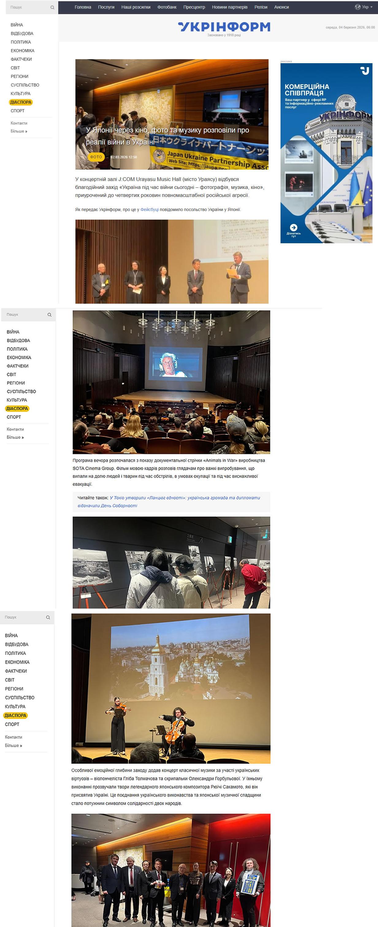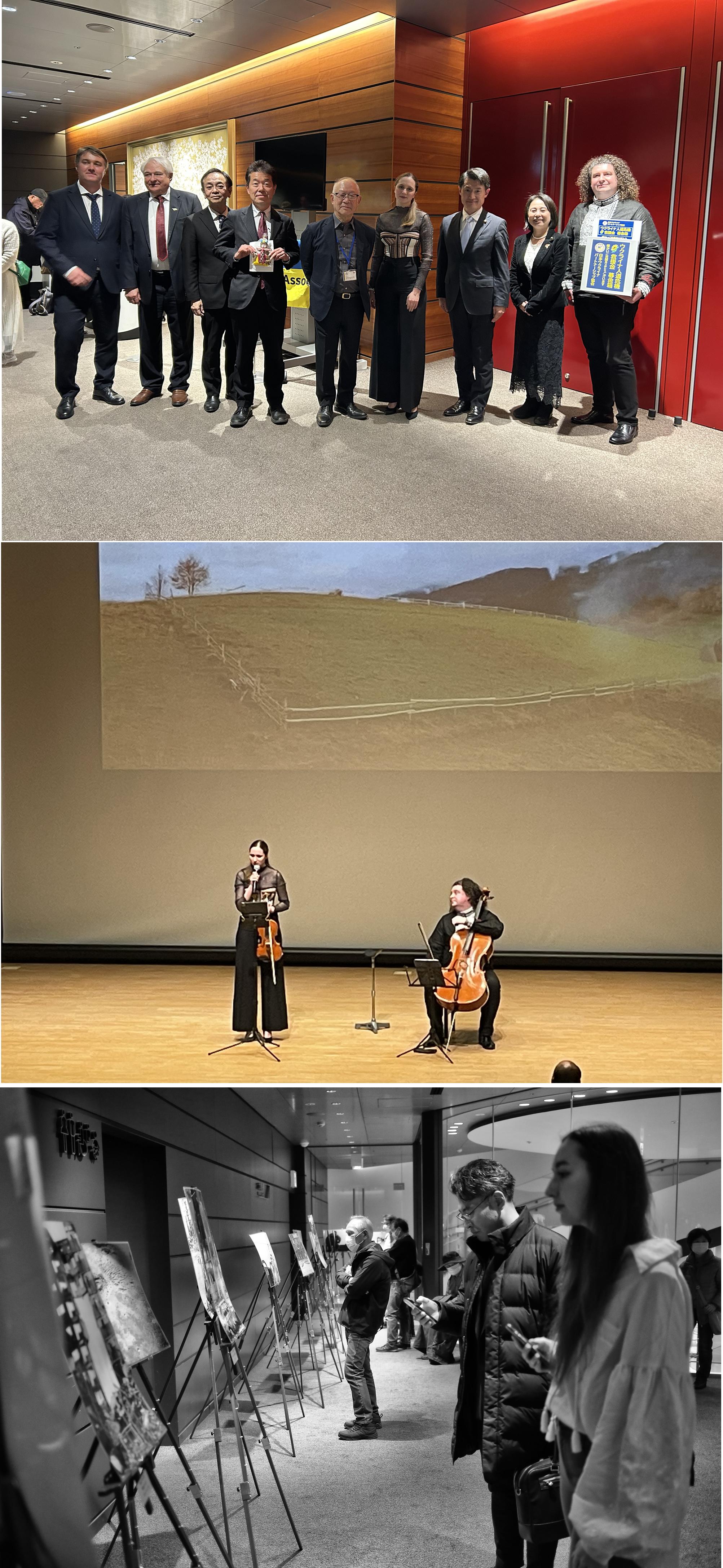 2026.2.28 昨日J:COM浦安音楽ホールの「コンサートホール」にてウクライナ写真展・音楽コンサート・アンソロジー映画上映を行い約120名の方々のご来場がありました。ウクライナ大使館よりペトロ・ホロショーク参事官、ユリヤ・ザモルスク2等書記官、アンドリー・ブクリエンコ3等書記官、浦安市地元より前衆議院議員矢崎堅太郎様、浦安市議会議員中村理香子様、及びソロミヤ会代表ソロミヤ・フリュント様のご出席がありました。また、前在日ウクライナ大使のセルギー・コルスンスキー様もご参加下さり私達と一緒に記念撮影に応じて頂きました。イベント終了後、何人かの方々から素晴らしい音楽と映画の企画について感動とお褒めのお言葉をメールで頂いております。この度は平日のご多忙の折ご来場下さった方々に感謝申し上げます。また、今回のイベントの為にウクライナの作曲家ゲオルギー・ボグダーノフ氏が特別に作曲した新作「叫び」をチェロ演奏者のGlib Tolmachovさんが演奏をしました。この音楽は、言葉では表現しきれない時代の痛み、内なる叫び、人間の感情を描いています。感動的な音楽を演奏していただきましたチェロ演奏者のGlib TolmachovさんとバイオリニストのOleksandra Horbulovaさんに感謝いたします。また、ウクライナの戦場で声を上げることが出来ない動物達の悲しみを描いた写真とアンソロジー映画「Animals in War」をご提供していただいたVera Blanshに感謝致します。